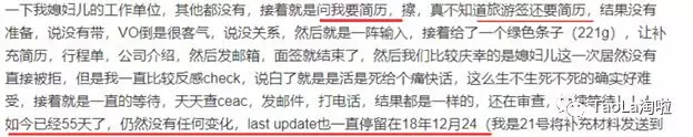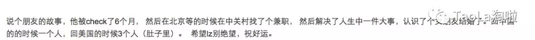 “说个朋友的故事,他被check了6个月, 然后在北京等的时候在中关村找了个兼职, 然后解决了人生中一件大事,认识了个女朋友结婚了。回中国的时候一个人,回美国的时候3个人(肚子里)。”