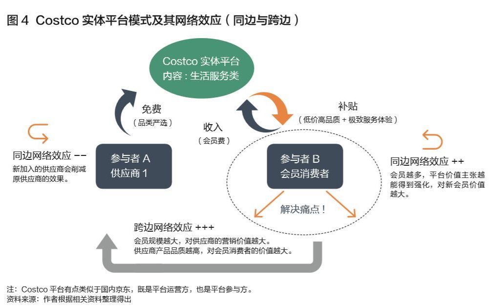 其次,需要提醒的是,做平台模式一定要有网络效应,没有网络效应的平台,就像传统的商业模式一样,是没有威力的。Costco平台是一个双边平台,参与者是供应商(包括Costco本身也是参与者)与会员消费者。该平台的网络效应主要体现如下: