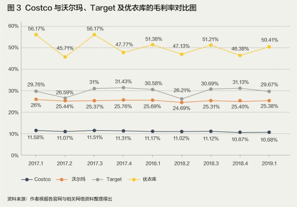 Costco的毛利率从2010年到2018年间,平均维持在10%~11%。我们将Costco、沃尔玛与Target这三家零售公司 2017年至2019年的毛利率进行比较(图3),Costco的毛利率只及沃尔玛的一半,相当于Target的三分之一。