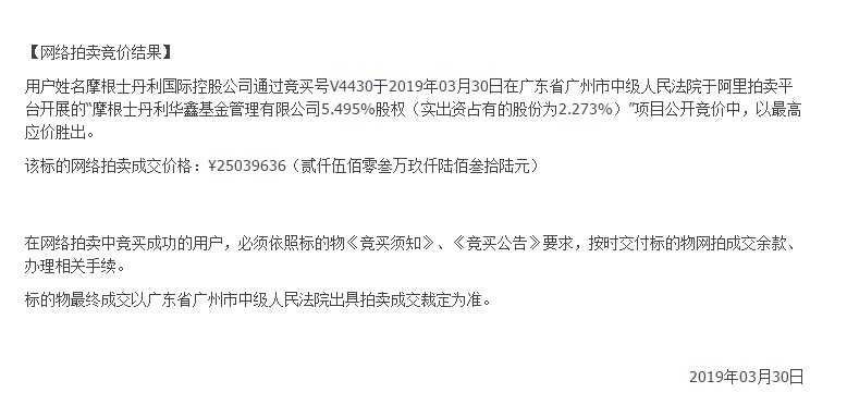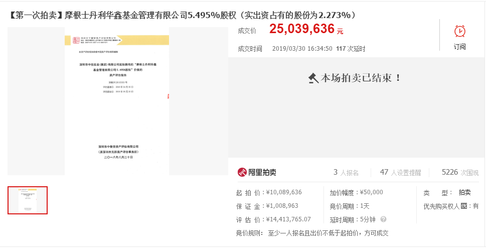 阿里司法拍卖信息显示,此次拍卖标的物为被执行人深圳市中技实业(集团)有限公司持有的摩根士丹利华鑫基金管理有限公司5.495%股权(实际出资占有的股份为2.273%),评估价格1441.37万元,起拍价为1008.96万元, 深圳市基石创业投资有限公司和摩根士丹利要求行使优先购买权。