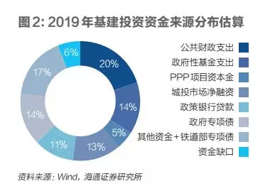 基建投资资金主要分为预算内资金、自筹资金、国内贷款、外资和其他资金渠道。海通证券研究分析表明,近几年国家预算内资金在基础设施建设投资中的比重有所上升,占比从2010年的11.6%提高至2017年的16.1%,但是与2017年占比超过50%的自筹资金相比,一般性财政支出在基建投资中的占比仍然不算高,自筹资金的变化才是决定基建投资的关键。