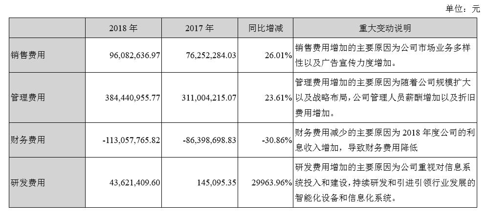 这些投入也体现在此次财报数据中。尽管2018年申通快递营收、利润实现双增长,但是营业成本增速高于收入增速,快递业务服务的毛利率为16.24%,较去年同期降低11.99%;在各项费用中,除了财务费用降低,销售、管理和研发费用均增长。其中,研发费用为4362.14万元,暴增29963.96%。申通快递对此解释称主要原因为公司重视对信息系统投入和建设,持续研发和引进引领行业发展的智能化设备和信息化系统。