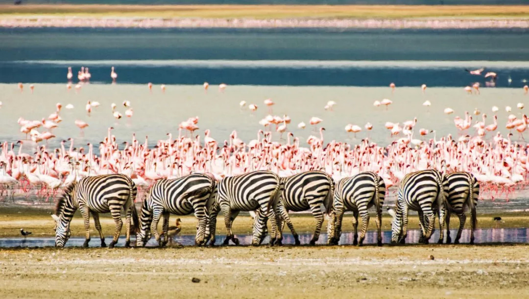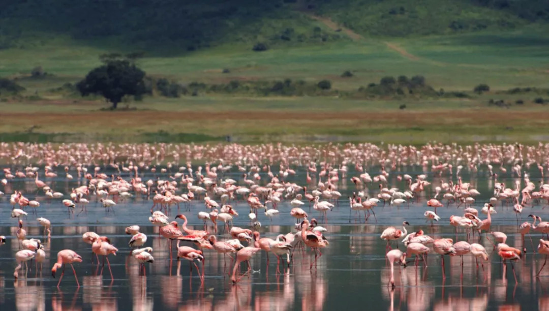 每年春天,恩戈罗恩戈罗火山口聚集了数百种迁徙至此的鸟类,壮观的画面是整个塞伦盖蒂的招牌,更是独家“放映”。然而,最震撼心灵的,必定是不计其数的火烈鸟用它们那粉色的容颜,覆盖整个碳酸盐湖面,宛若一层粉红色薄纱铺撒在湖面上,美丽异常。