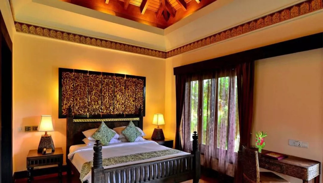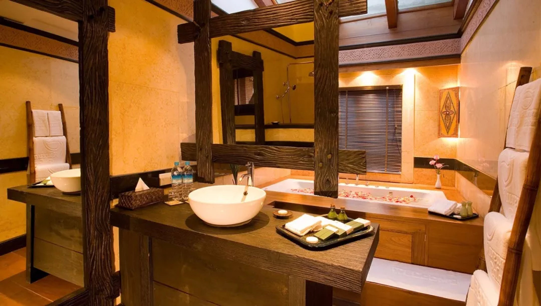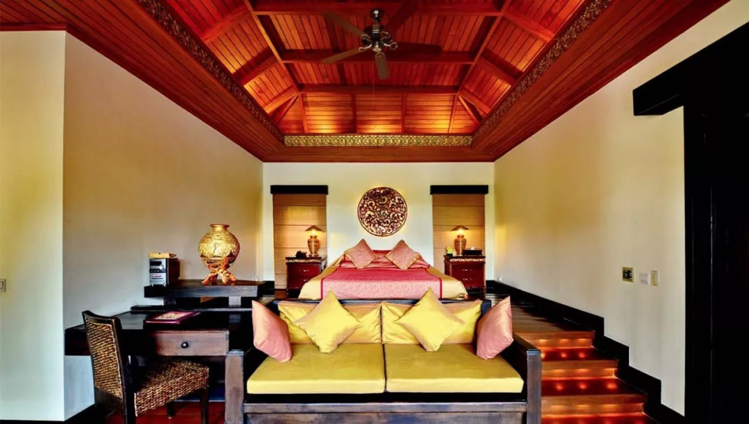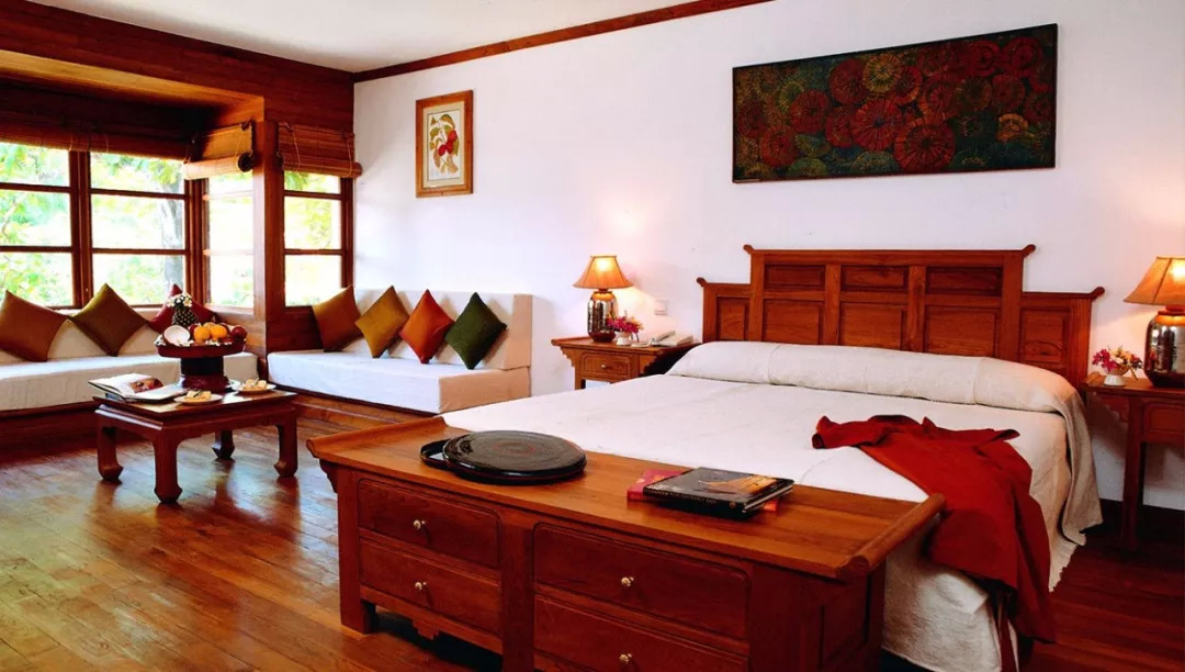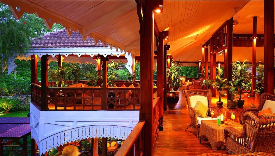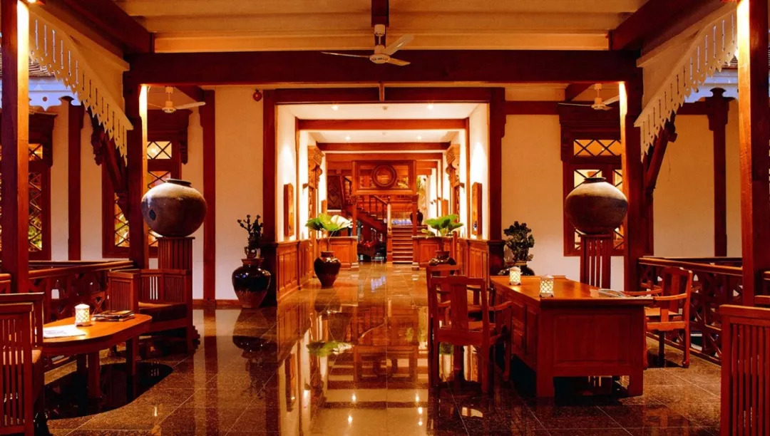当你穿过长廊来到大堂,映入眼帘的是古色古香的柚木及藤制家具,搭配明亮洁净的花岗石地板,尽现当地的佛学风情。