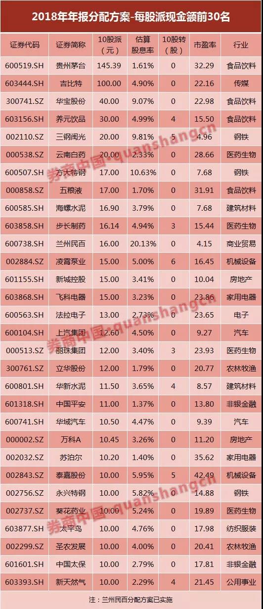 就分配方案的每股金额来看,贵州茅台位居A股第一位,以“10派145.39”元创下A股历史上最高纪录,吉比特位居第二,其余派现规模较高的股票还有: