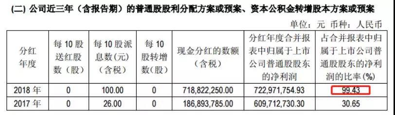 吉比特9日晚发布年报称,拟向全体股东每10股派发现金红利100.00元(含税),合计派发现金7.19亿元,几乎派发完当期利润,占2018年7.23亿元股东净利润的99.43%。
