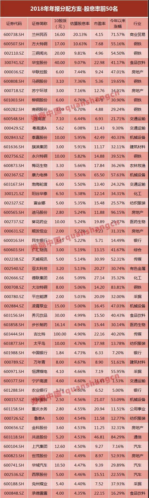 其中,兰州民百、方大特钢、三钢闽光、华宝股份等4股的股息率超过9%,其中兰州民百的股息率一度超过20%,但该分配方案已经实施,其余3股的分配方案是: