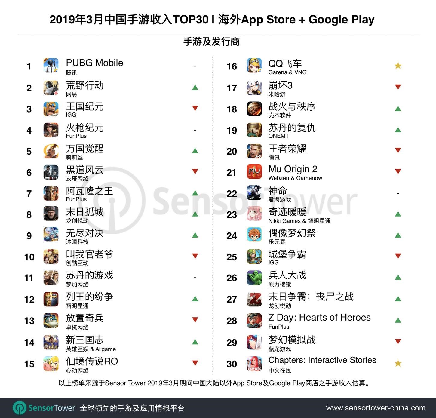 其他游戏方面,3月份新上榜的游戏有两款,分别是腾讯旗下的《QQ飞车》手游和中文在线旗下的剧情互动手游《Chapters: Interactive Stories》,这两款游戏均是在海外获得成功的新品类手游。