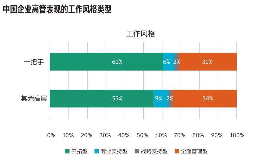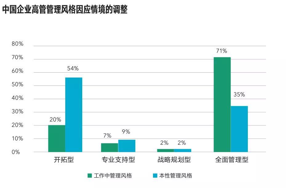 这个结果亦得到细分数据的支持。各行业企业高管弱化权威型领导力行为的比例,均超过强化者,尤其以制造业逆转幅度最高,达72%。而企业一把手权威型逆转高达71%。企业高管的本性管理风格以开拓型为主(54%),全面管理型为辅(35%)。但实际展现的管理风格,前者降至20%,后者则增至71%。(参见图表“中国企业高管管理风格因应情境的调整”)