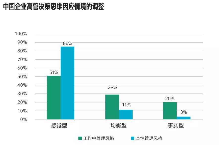 在决策思维的维度,86%的企业高管的本性决策思维为感觉型。而实际展现的决策思维,感觉型降至51%,均衡型和事实型决策者比例都有相当明显的提升。(参见图表“中国企业高管决策思维因应情境的调整”)