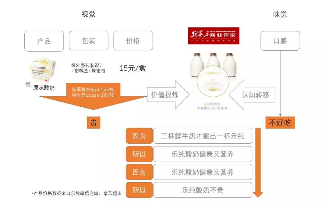 当产品价格高于顾客常规认知时,品牌方如何打动顾客呢?在此,“比例偏见”的应用恰好可以把“劣势”(用户感知的“劣势”)变“优势”,从“价格”到“价值”转化,以乐纯酸奶为例,挖掘“产品特点和顾客诉求”进行匹配,制作酸奶的工艺过程,从“三杯牛奶”到“一杯酸奶”很形象的提炼,且又与顾客对“健康”、“营养”等诉求非常契合,因此就会形成“物有所值”的感受,当然这也和哪部分用户群相关,是感性消费、还是理性消费,在一些产品上会有差异,但此种提炼后,此品牌的产品就从不同角度打动了不同类的消费者,这是品牌营销中顾客旅程的认知、认可、认同。
