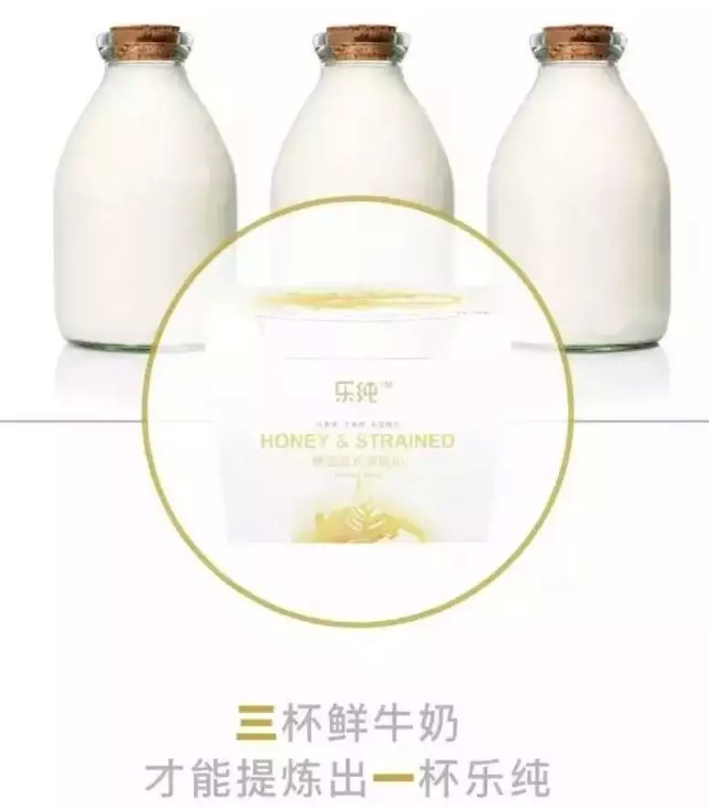 乐纯酸奶最新的宣传是:“每一盒乐纯三三三倍酸奶都使用德国顶尖的滤乳清酸奶制作工艺,用三倍的鲜牛奶和三倍的乳酸菌发酵,再用专利工艺脱去整整2/3重量的水分,只留下三倍的纯净营养。”