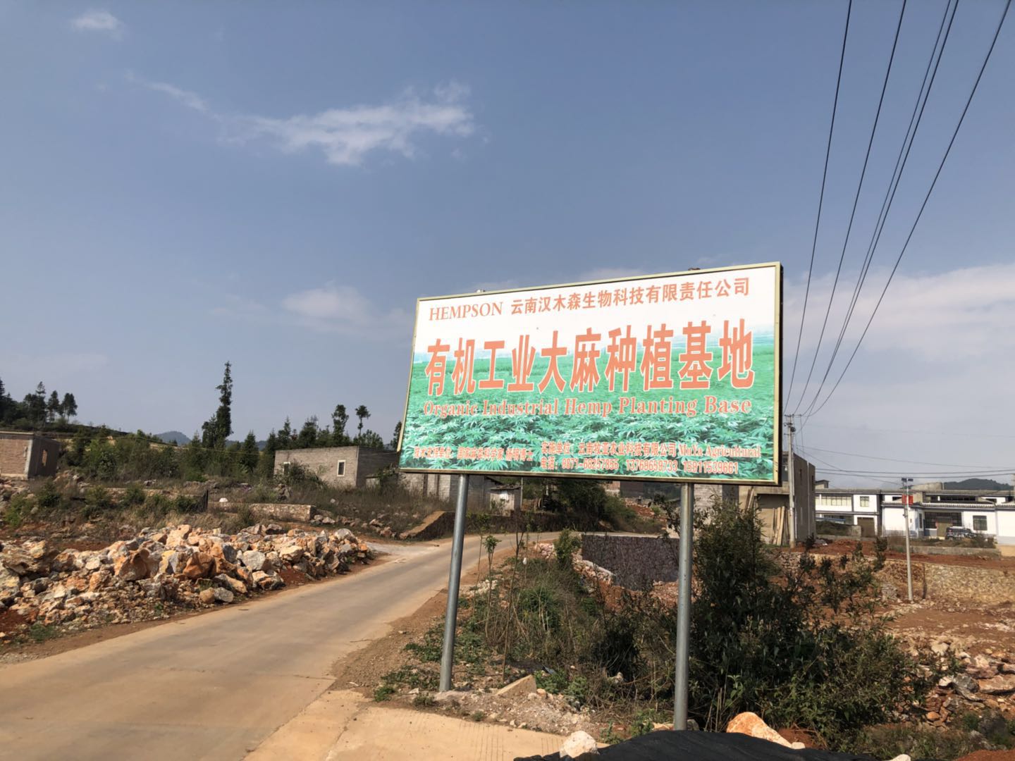 随后界面新闻记者去往龙津药业披露的工业大麻种植地。在师宗县龙庆乡豆温村,界面新闻记者进入村口,便看见路边竖立着:有机工业大麻种植基地告示牌。在标牌的右下角,实施单位为牧亚农业。
