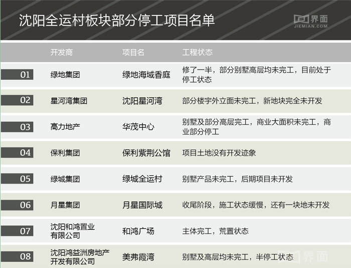 看起来情况稍好一点的是与绿地仅一街之隔的旭辉御府,作为在沈阳唯一的项目,旭辉御府的售楼处相对比较热闹,工程从外观上看起来也在照常进行。但据沈阳地产业内人士透露,在全运村,旭辉也面临着同样的资金问题,这个项目虽然在去年完成了既定的销售目标,但几乎没有利润。界面新闻记者调查发现,这个项目的高层目前最低价在3700元/平方米左右,属区域内最低之一,而别墅的均价也低于其他几家。