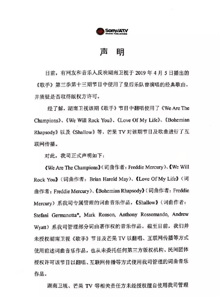 去年,索尼收购了EMI Music Publishing流落在外60%的股份,拿下约90%的股份,基本全资拥有了EMI Music Publishing。此后,皇后乐队作品的词曲版权就落到了索尼旗下的索雅音乐版权手中,也因此,此次《歌手》对于皇后乐队的侵权事件是由索雅发声主张权利。