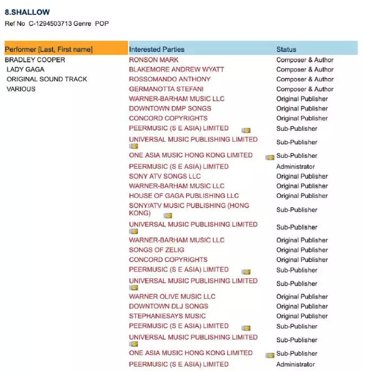 歌曲《Shallow》的词曲版权则更为复杂一些。由于创作者较多,这首歌曲的词曲版权归属于不同的公司,索雅只拥有部分词曲著作权,Peer Music、One Asia以及Universal Music Publishing(环球音乐的词曲版权公司)等都有份额。
