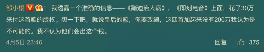 陈伟表示,现在翻唱、改编歌曲的版权费高涨,甚至有一首歌曲报价高达100-150万的现象。微博音乐大V邹小樱也曾在微博评论中回复网友“在《即刻电音》中,仅《蹦迪治大病》一首歌就花费了30万元的授权费”。