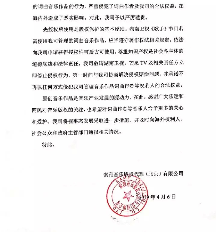 4月6号晚的第一则声明:《歌手》侵权属实、请速来协商赔偿,不排除协商不成对簿公堂的可能性。