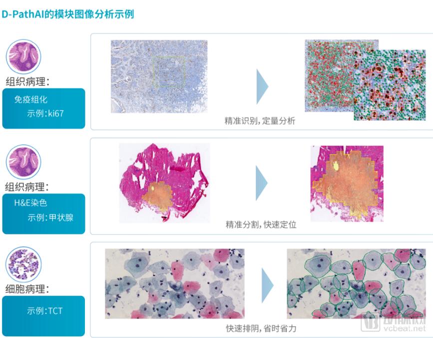 在产品设计上,迪英加以D-Path AI人工智能病理辅助诊断系统为核心,在细胞病理方向开发了20余个智能分析模块,可协助诊断胃癌、肺癌、膀胱癌、乳腺癌、肾癌、前列腺癌等癌症分型。在分子病理方面,迪英加能运用人工智能对探头液样品、血细胞以及像宫颈切片等进行判读。