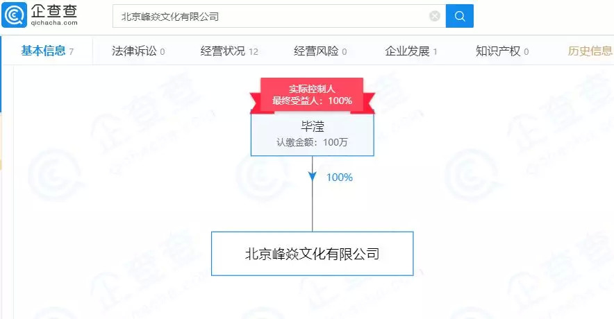 在张丹峰“峰焱文化有限公司”里,毕滢目前任法定代表人并持股100%。
