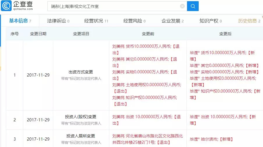 而在晞彤影视文化(张丹峰工作室)中的法定代表人也是毕滢。同时,在2017年底工作室做了最后一次股权变更后,毕滢成为工作室的唯一股东,持股比例100%。