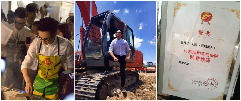 然后,他就真的来了蓝翔。开挖掘机,赠书合影、集体摊煎饼,最后还获得了校方颁发的“蓝翔烹饪学校荣誉教师”证书。