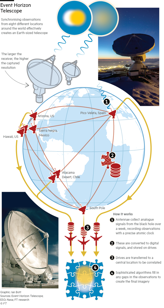 在来自非洲、亚洲、欧洲、北美洲、南美洲的200余名研究人员的共同努力下,“事件视界望远镜”(EHT)项目历经多年筹备后,在2017年4月通过甚长基线干涉测量(VLBI)技术,连接分布于美国、墨西哥、智利、法国、格陵兰岛和南极的8处射电望远镜,正式开始拍摄M87中心黑洞,以及距离地球2.6万光年、位于银河系中央的超大质量黑洞人马座A*。