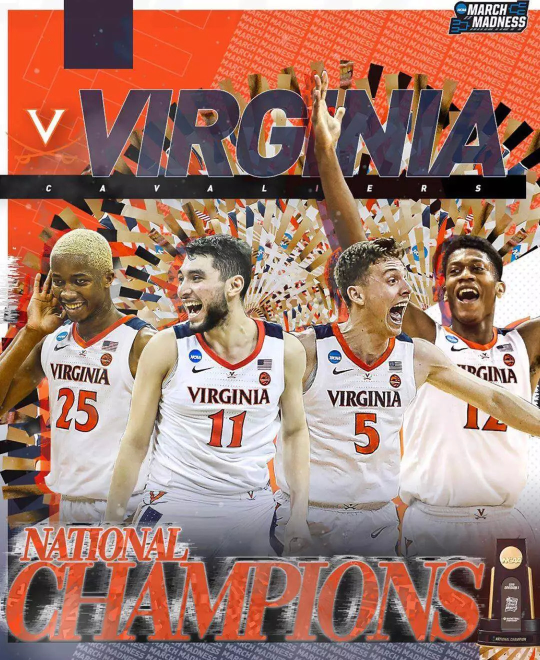 疯狂三月落下帷幕,弗吉尼亚大学经过一个加时赛的苦战,85:77,拿下了德州理工大学,抱得奖杯归。