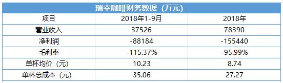 瑞幸咖啡官方公布其2018年营业收入为7.84亿元,净利润为-15.54亿元,毛利率为-95.99%。咖啡的毛利率一般在50%左右,最高可达80%,星巴克的毛利率则已连续5年超过50%,而瑞幸咖啡毛利率为负数。