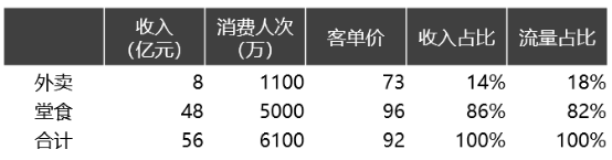 公开数据:西贝2018年收入56亿,其中外卖收入8亿;另,堂食约5000万人次,外卖约1100万次订单
