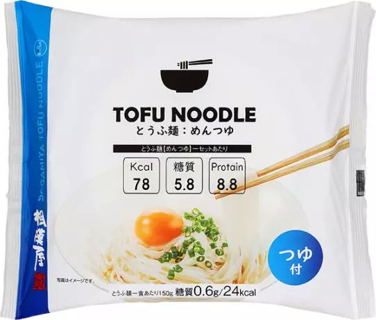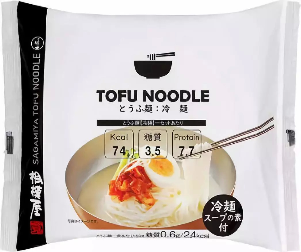 豆腐面是相模屋的又一力作。从面条到面汤,均采用100%低脂豆乳制成。虽然由豆乳制成,但就口感上来说,并非是简单地把豆腐做成条状,而是实现了和小麦面条一样的Q弹口感。其次,这款豆腐面中添加了蔬菜提取物和调好的佐料,可直接凉拌或微波炉加热,从而成为方便食品界的健康新选择。
