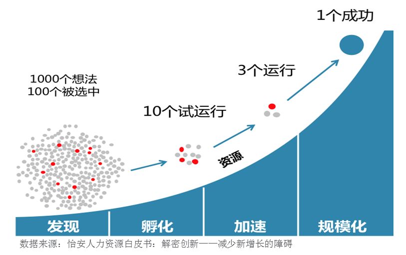 创新需要经过发现、孵化、加速和规模化四个过程,这意味着在过程中会有大量的失败出现,往往只有极少量的创新理念可以最终获得成功。对待创新应有“试错容错”的精神。我们看到越来越多的企业进行了“容忍失败”的内部文化改革,并在制度层面,通过建立内部创新容错机制来促进创新。