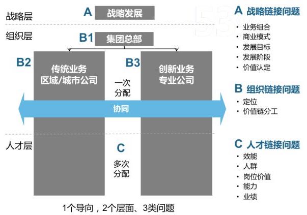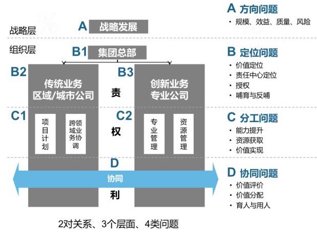 在组织的顶层设计中,不是简单的分工的明确,而应从澄清后的战略方向出发,从责(定位问题)、权(分工问题)、利(协同问题)三个层面系统考虑不同组织的完整承载。而这两对关系以及三个层面的设计,正是组织效率提升的关键所在。
