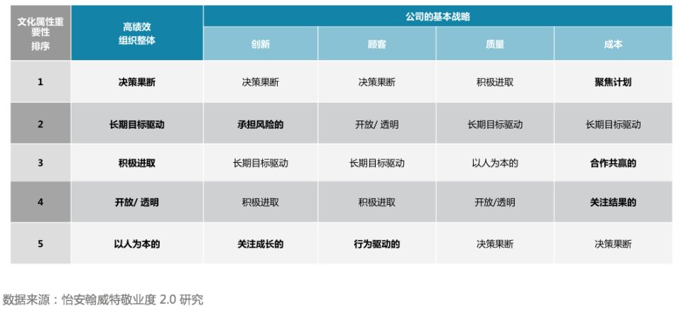 不管是“舰队”的创新、“快艇”的规范,还是“小老树”的转型,CEO都需要为一系列的变革行动塑造文化。根据怡安的研究,高绩效组织实现了关键文化属性与公司基本战略的高度契合,动态塑造与公司战略优先级匹配的文化氛围。