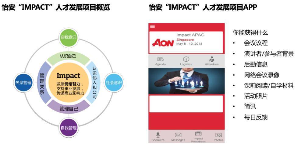 以怡安自己的人才发展项目“IMPACT”为例,基于公司全球化、协同性业务组合的特性,针对资深贡献者,以发展情商,支持事业发展和传递商业影响力为目标,怡安建立线上线下打通的全流程发展体系,从在线会议和线上课程自学到线下集中培训,过程中融入经理及同伴的沟通反馈。