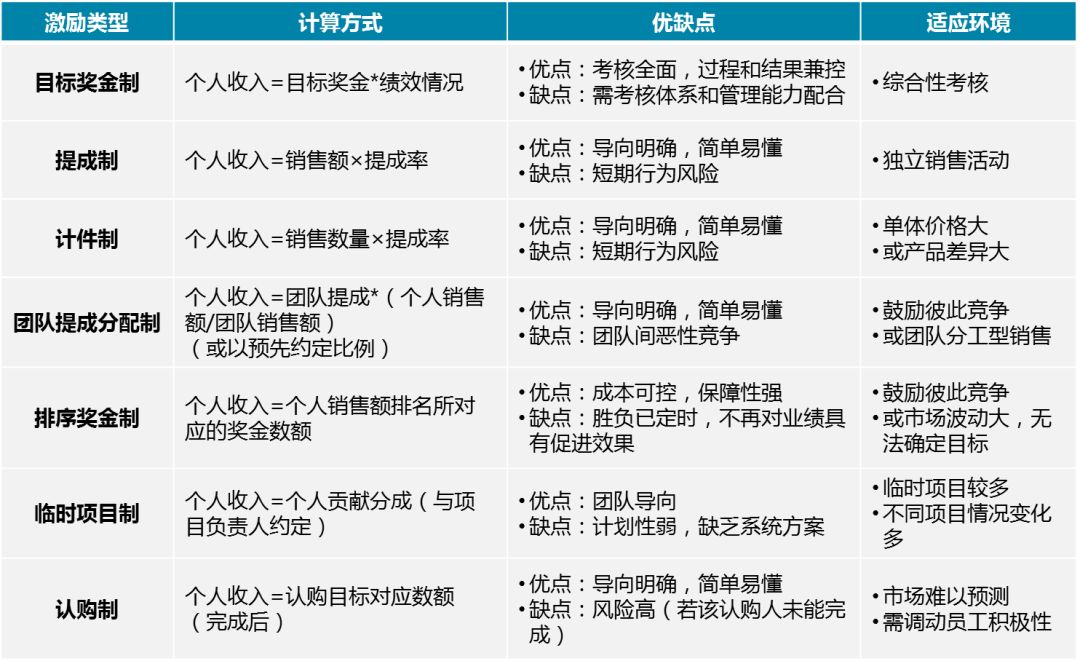 对于销售人员的激励体系设计,CMO应当从激励原则设计开始,通过激励方案实施及回顾逐步优化。怡安与众多优秀企业合作,通过基于业务价值链环节的关键指标分析、从基本薪酬、激励工具、激励标的、激励曲线、支付频率、约束机制等维度进行考量,帮助CMO优化销售激励体系。销售激励模式因为行业不同而差异巨大,以下是常见的销售激励模式: