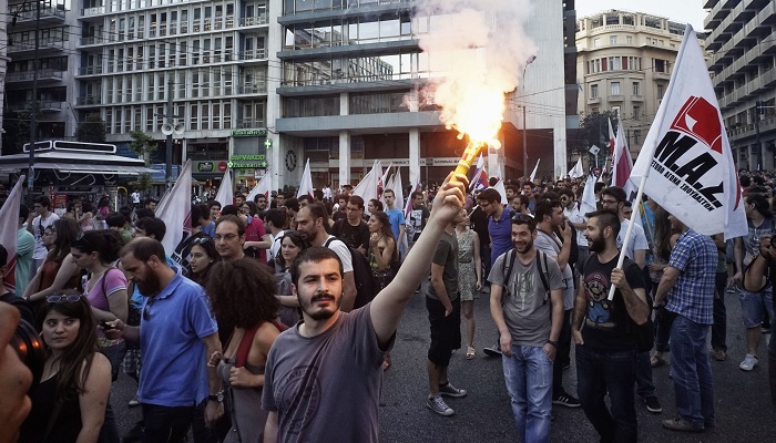 希腊劳工团结联盟公会(PAME)的武装成员在黎明时分攻入位于雅典中心的政府大楼,降下欧盟旗帜,并挂出一副巨大的横幅,上面写道:“我们流的血够多了。我们付出够多了。”