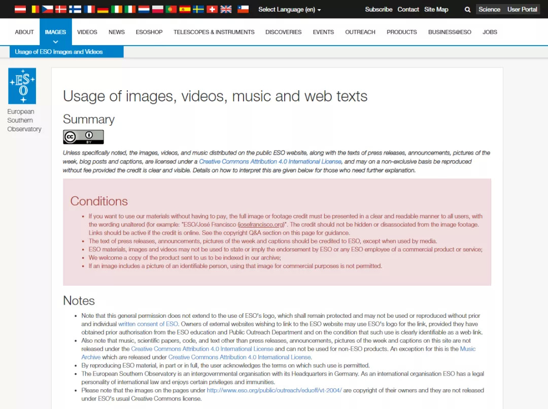 除非特别标注,在ESO公共网站上分发的图像、视频、音乐,以及新闻稿文本、公告、每周图片、博客文章和字幕,均通过“知识共享-署名”(CC-BY)4.0国际版协议授权,只要清晰可见地标注了来源,即可非独占、免费地使用。