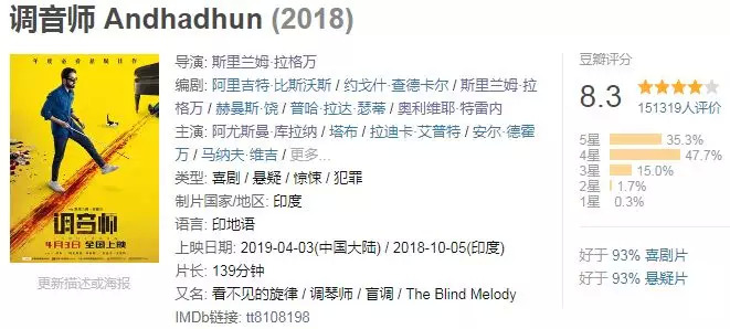 长片版《调音师》不仅在豆瓣上拿到了8.3分的成绩。
