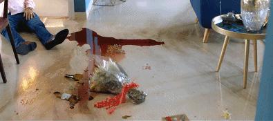 礼物和红酒摔在地上,土豪靠在墙边,脖子上鲜血直流。