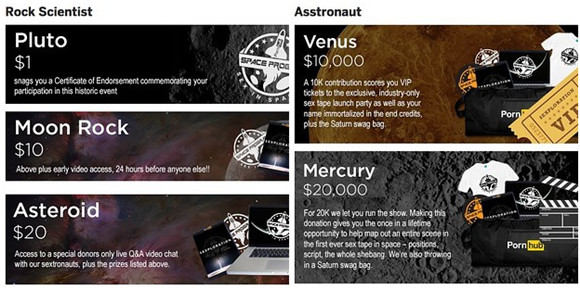 要是为这部史上第一的太空色情片出资,你能得到什么回报?从1美元到15万美元,回报从感谢证书、提前看片、免费高清版、签名版、跟艳星聊电话/吃午饭、出席片子发布会、由你写剧情等一直加码。如果出资高达15万美元,你还可以得到其中一位艳星拍摄时的全套太空服。嗯,含内衣。