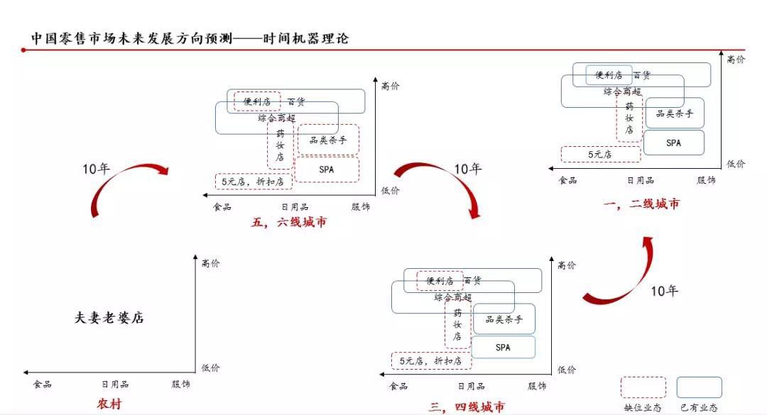 每一个梯度的区域零售业态的相应成熟需要往前推十年。零售基础设施的完善成熟坐在了时间机器上,显然,这和中国广袤的消费市场以及多元化的消费需求的有着密切关系。也给创业者带来了无限的机会。