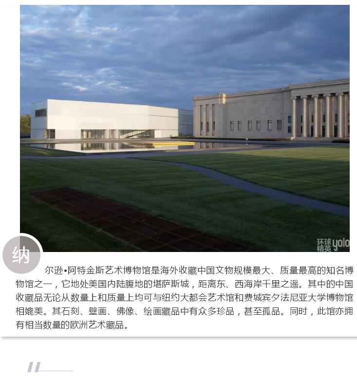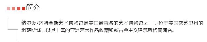 纳尔逊·阿特金斯艺术博物馆最大的特点就是它丰富的中国艺术藏品,数量有近8000件,其中有许多艺术品即使在世界博物馆中也算得上是最顶级的收藏,其古代绘画、壁画、佛像、家具藏品中有众多珍品,甚至孤品。数量惊人加上质量精美绝伦,可与纽约大都会艺术馆、费城宾夕法尼亚大学博物馆一较长短,号称拥有除亚洲之外最权威的中国艺术品收藏!