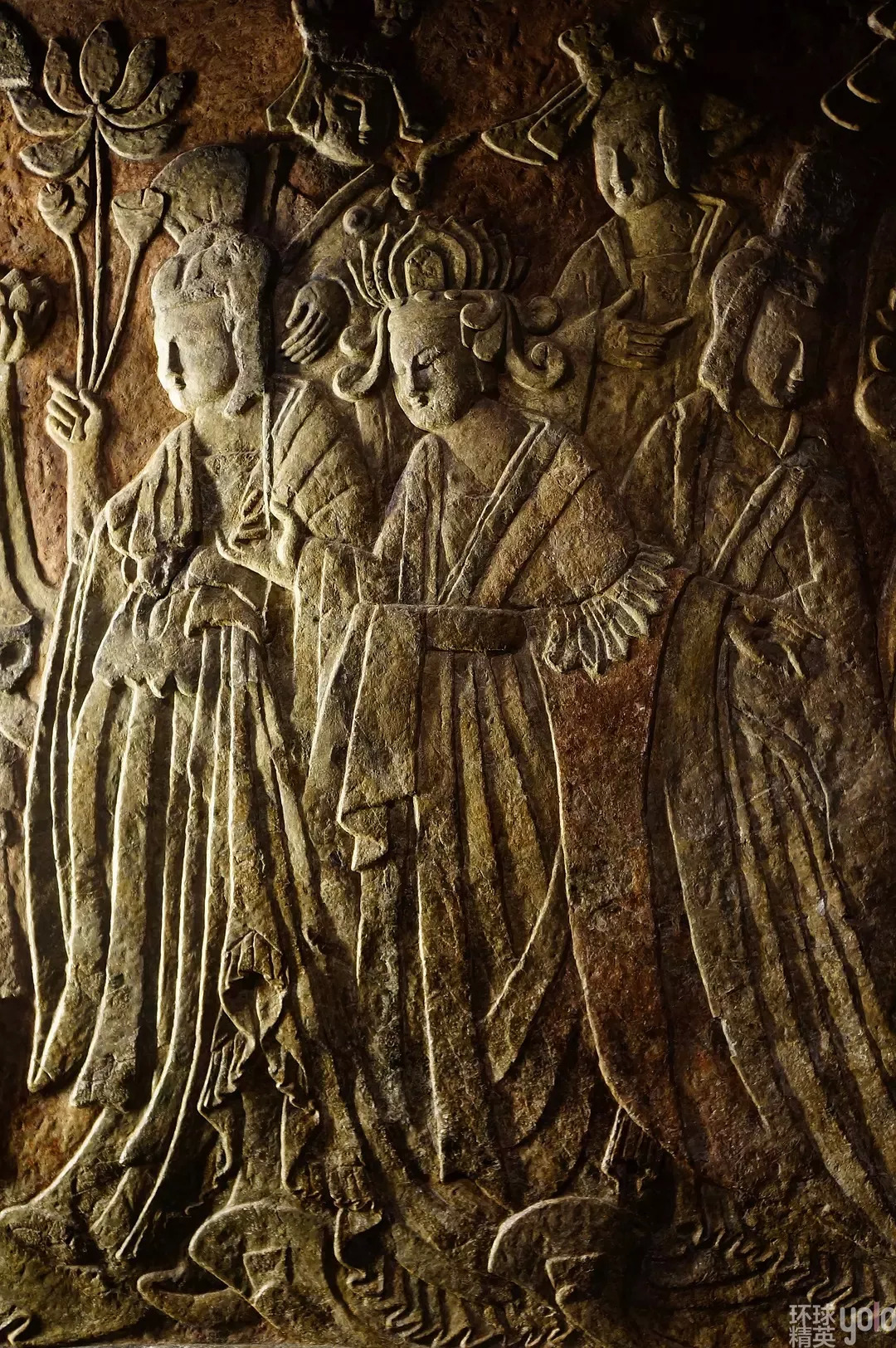 与云冈石窟的浮雕相比,《帝后礼佛图》已经开始摆脱古印度的犍陀罗风格,而加强了本土的艺术语言色彩。作品变得单薄平浅,高浮雕的圆润光影不复存在,线条成了艺术形式表现上举足轻重的角色。人与人的空间、人体的曲折起伏都用线勾勒,特别是衣纹的处理,格外舒展流畅、疏密有致,颇有汉代画像破以线求形的神韵,表现出中国民族文化与外来佛教艺术的很好融合。