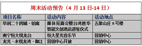 春暖花开,阳光明媚。周末又如期而至!你想好怎么过周末了吗?据界面楼市不完全统计,本周末(4月12日-14日)南宁各楼盘“蓄势待发”,活动精彩不断,华润二十四城·铂寓举行酒店进驻仪式,龙光·水悦龙湾·御江营销中心开放,南宁恒大悦龙台星光音乐节开唱……趁此良机,若不及时出门寻乐,岂不是辜负了这大好韶光?