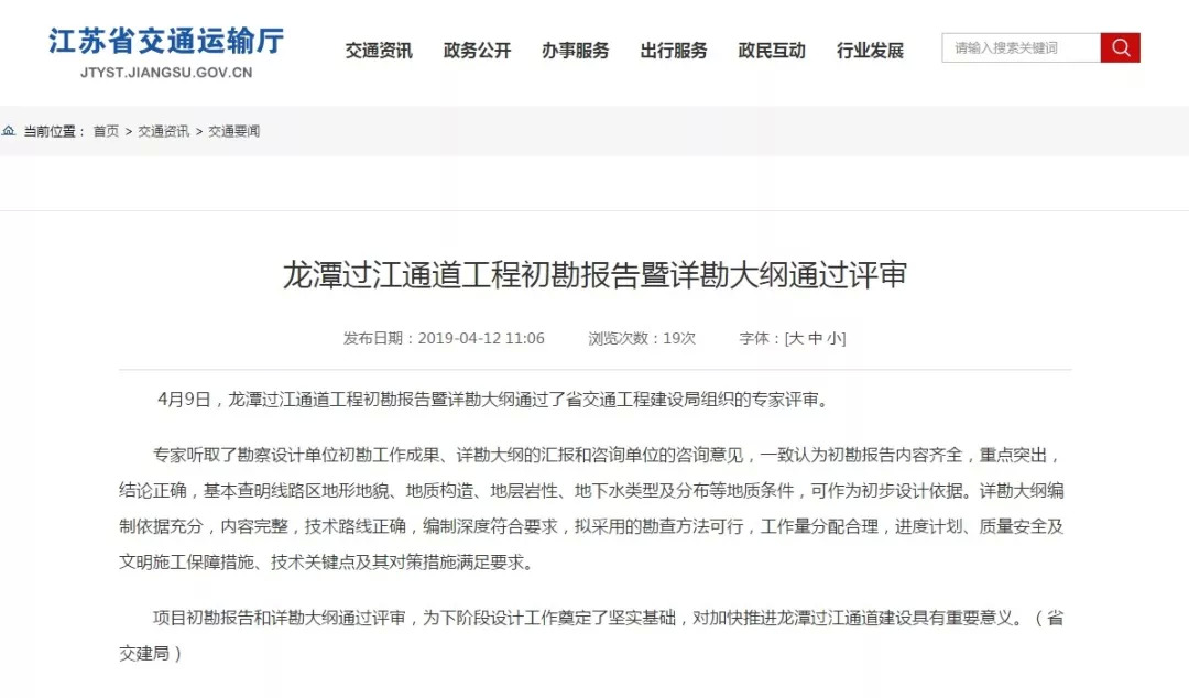 江苏省交通运输厅门户网站于今日(2019年4月12日)发布了《龙潭过江通道工程初勘报告暨详勘大纲通过评审》。