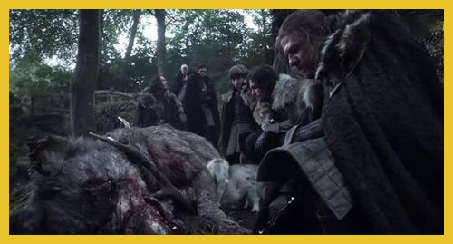 在第一季开头,史塔克们发现了雄鹿和冰原狼双双惨死的景象。这正预示了,鹿家劳勃·拜拉席恩和狼家奈德·史塔克的死亡。▼