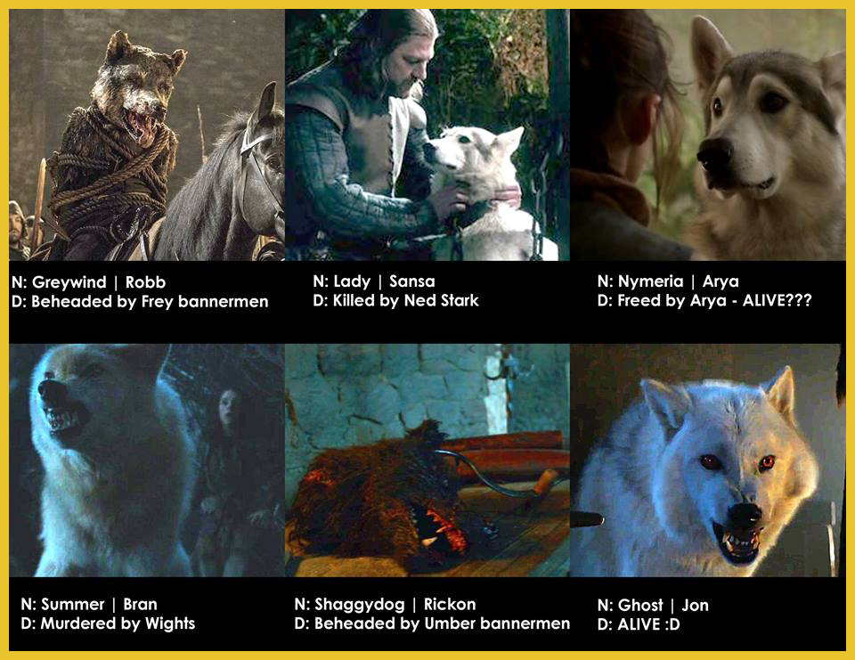 罗伯的灰风和瑞肯的毛毛狗,都随主人一起被杀了。▼