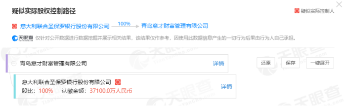 据天眼查信息显示,青岛意才财富是一家外商独资企业,该公司成立于2016年9月30日,法定代表人是Giamberto Giraldo,注册资本3.71亿元,意大利联合圣保罗银行股份有限公司全资控股。经营范围包括财富管理服务,财富管理产品研发,投资咨询、企业管理咨询、财务管理咨询、商务信息咨询、经济信息咨询;在金融专业领域的技术咨询和技术服务;以服务外包形式从事金融后台服务。
