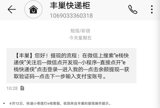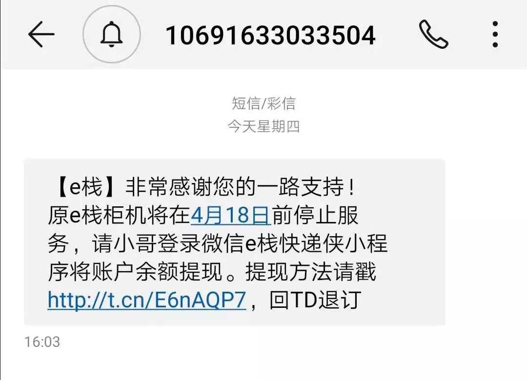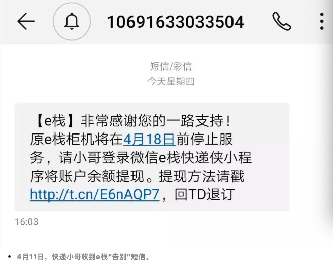 曾在智能快件箱市场占据一席之地的“中集e栈”要退出市场了。4月11日,不少在e栈注册的快递小哥收到了一条停止服务短信,称原e栈柜将在4月18日前停止服务,快递小哥可登陆其小程序将账号余额提现。